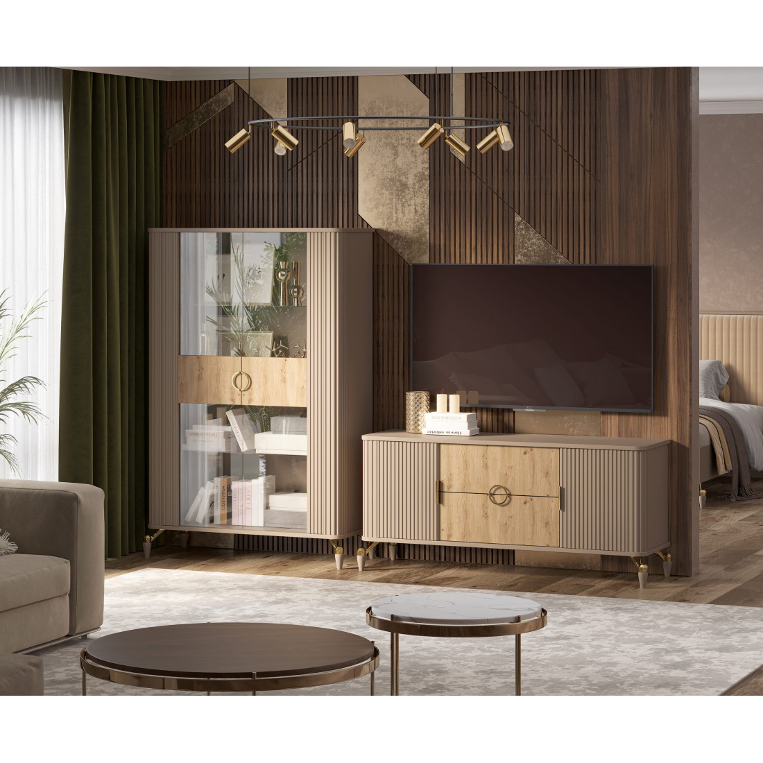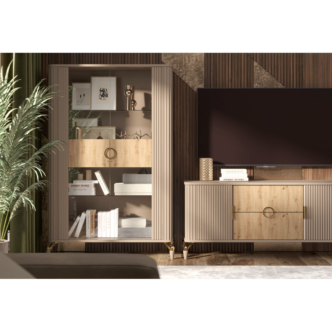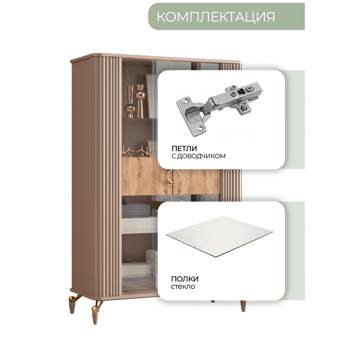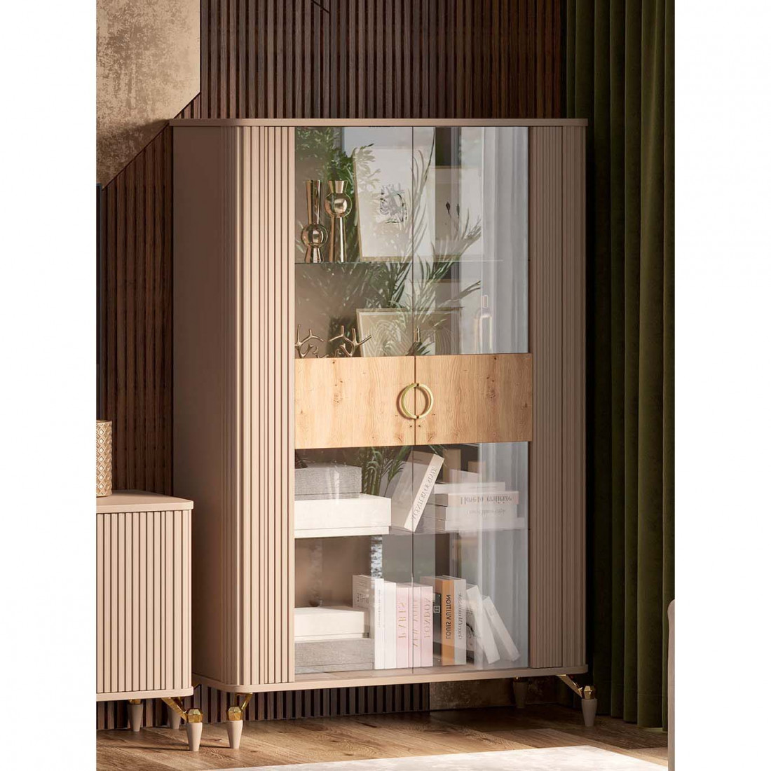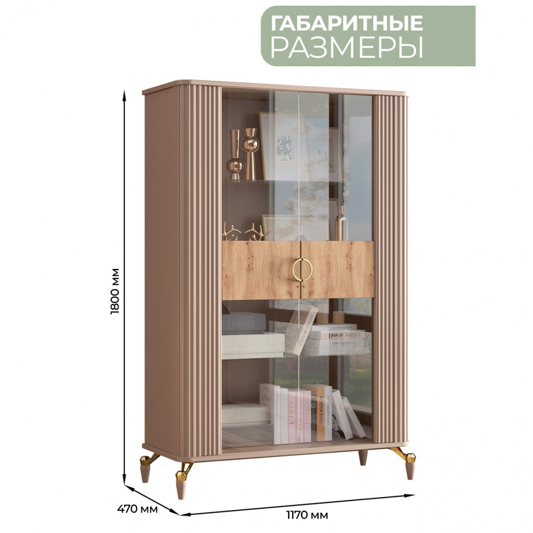 Витрина 2х дверная из коллекции "Мадрид" предлагает много места для хранения различных предметов, таких как книги, декоративные элементы и другие вещи.