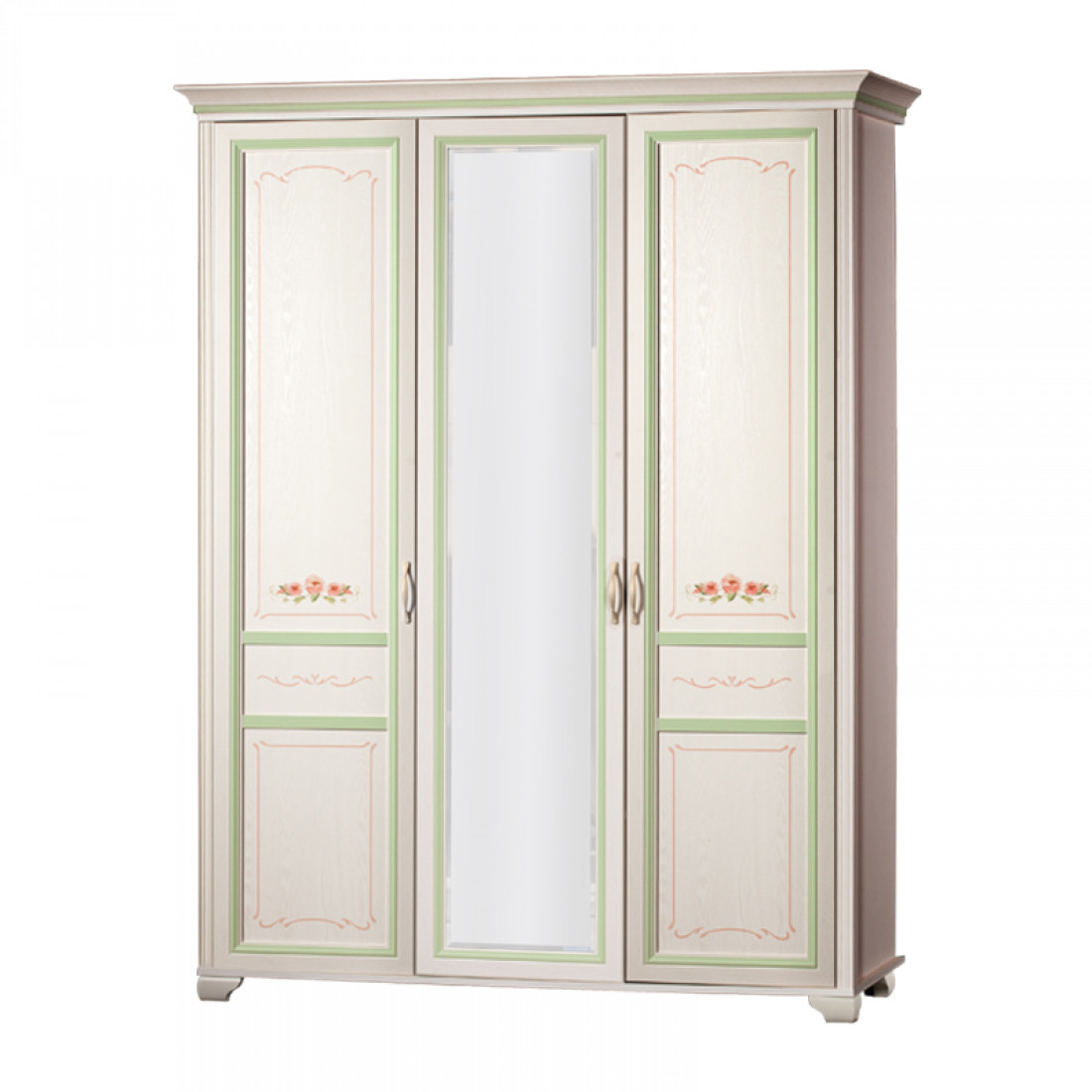 Золотистые ручки с белой патиной подчеркивают классический стиль мебели