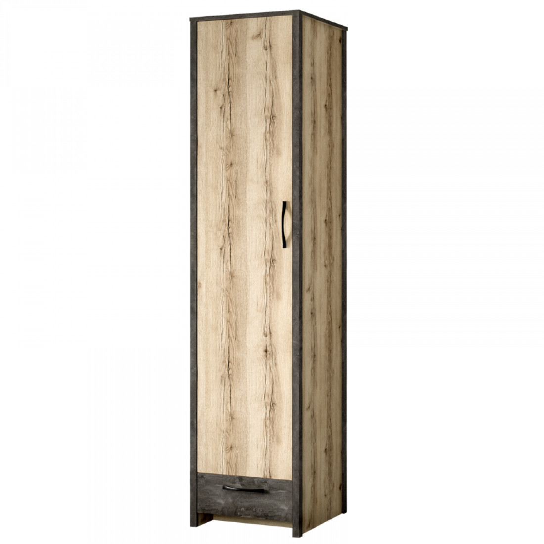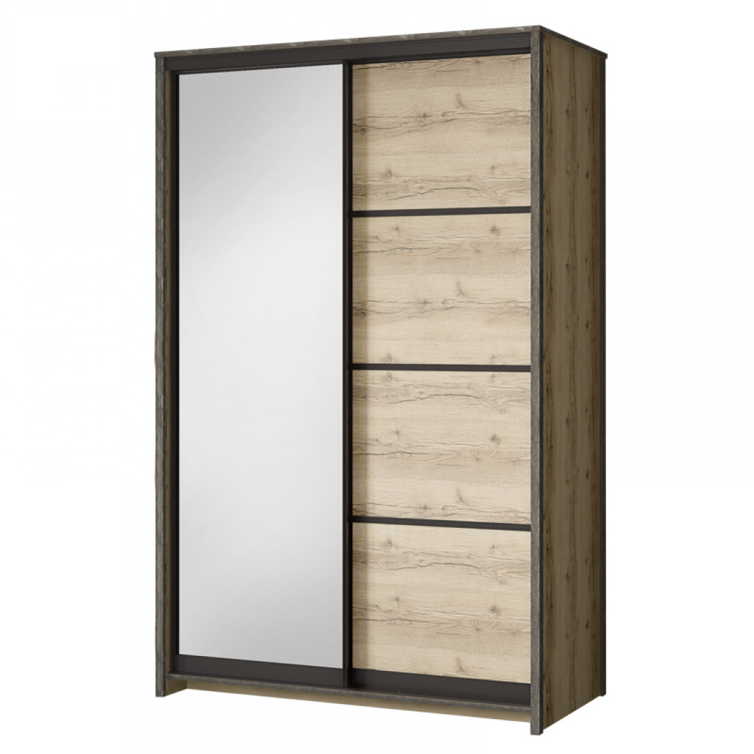 Фасады: ДСП, декор – дуб делано, ЛДСП железный камень, зеркало с фацетом. Рамка: МДФ, декор – сталь черная