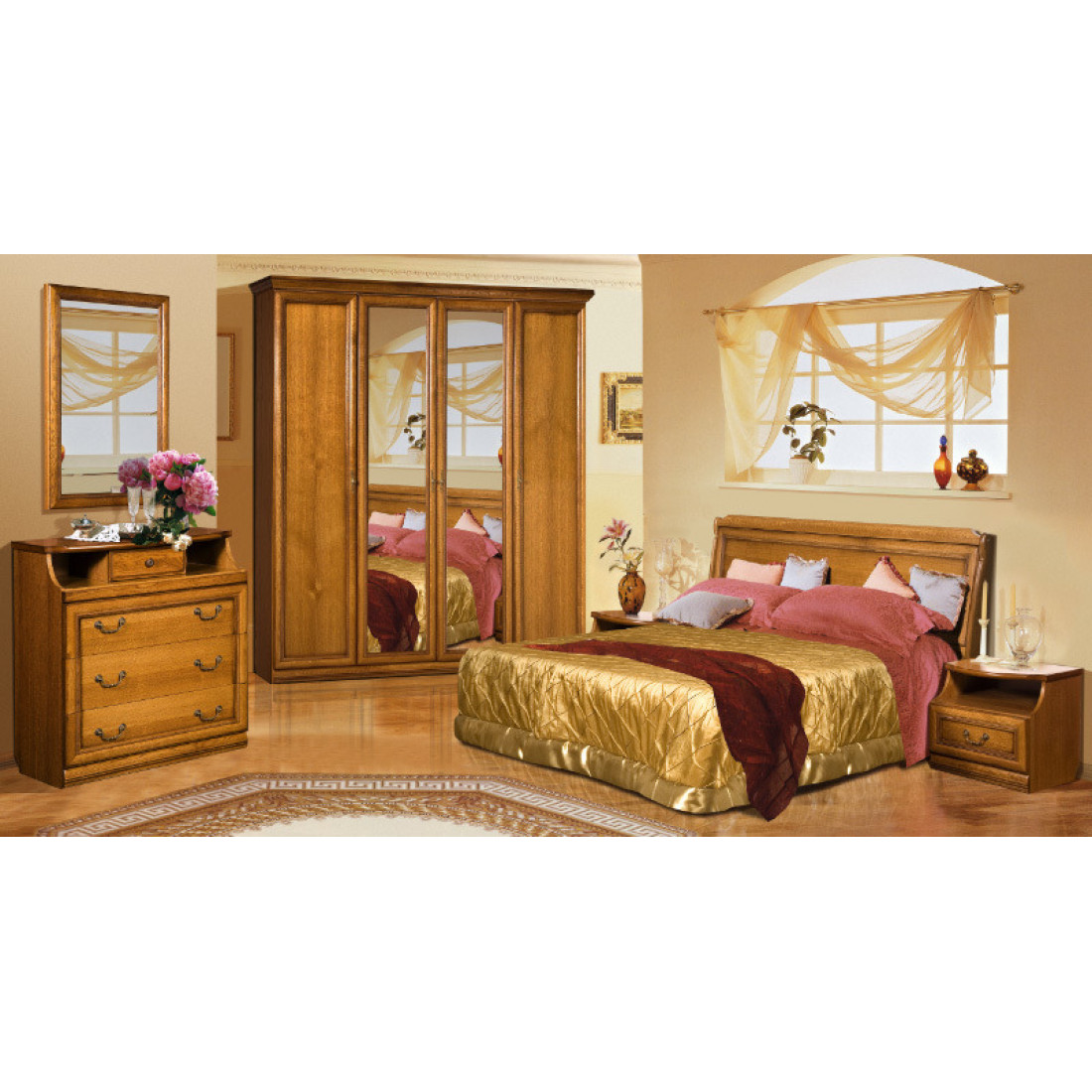 Простота форм и вместе с тем богатство строения массива и шпона дуба придаёт спальне свой шарм, приятно сочетая солидность и утончённость, предлагая потрясающее удобство и удивительную практичность. Кровать Нинель выполнена без изножья в цвете табак с патиной.