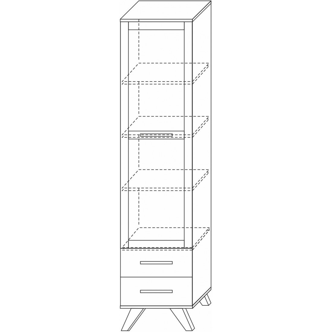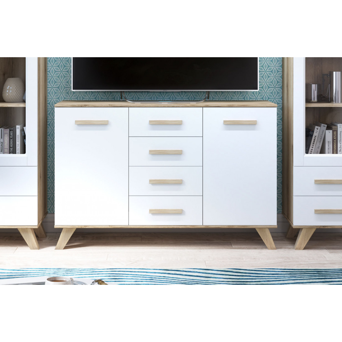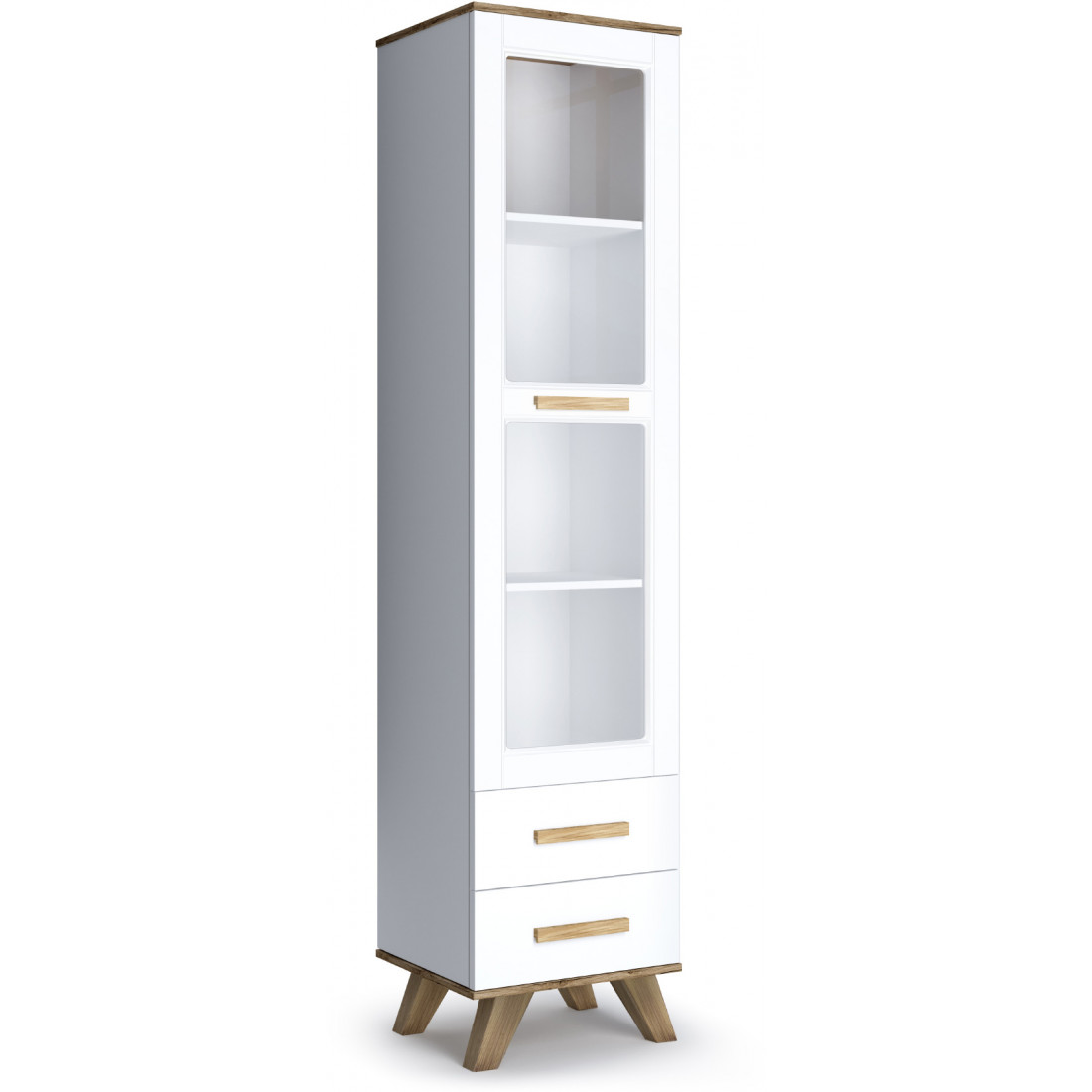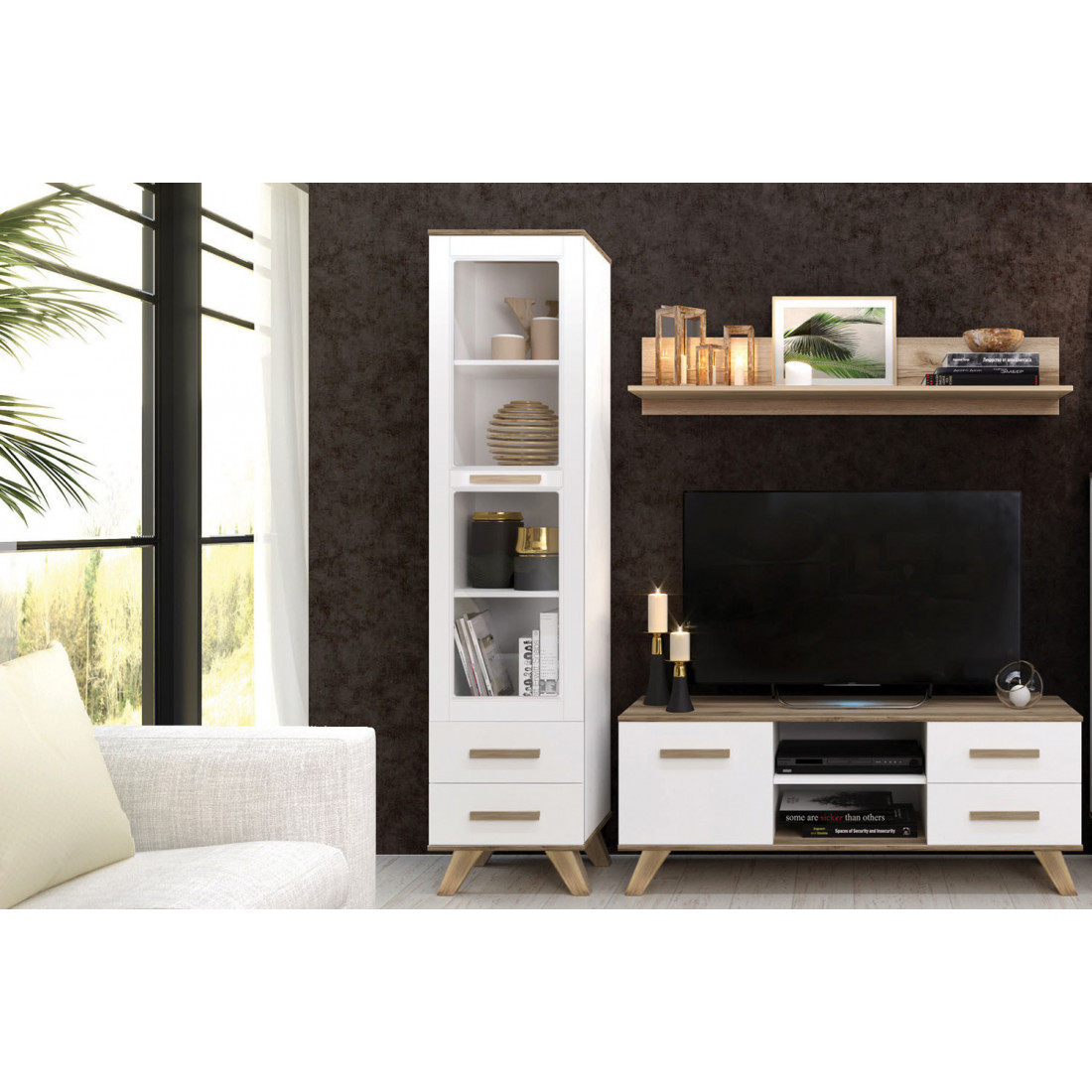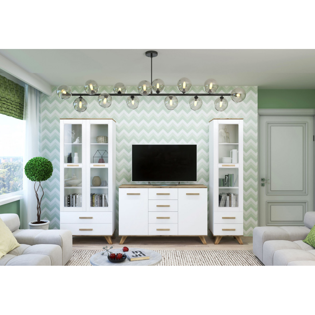 Витрины с прозрачным стеклом и многофункциональный комод в скандинавском стиле. Витрины позволят хранить посуду, книги и другие вещи. В нижней части шкафов-витрин предусмотрены выдвижные ящики. В центральной части композиции стоит большой комод - это вместительный элемент гостиной с ящиками и дверцами, который служит для размещения различных элементов, а так же телевизора. набор мебели представлен в исполнении ЛДСП «Дуб каньон» + «белый», фасады - МДФ в пленке ПВХ «глянец белый».