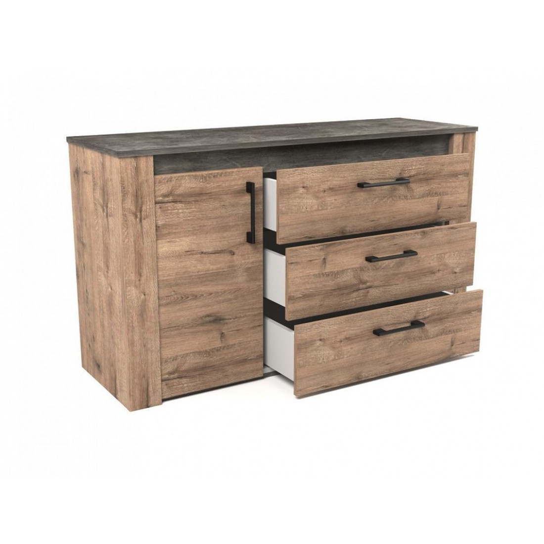 В комоде Денвер располагаются три выдвижных ящика и отдел с полкой. Шариковые направляющие надежно удерживают ящики при открывании.