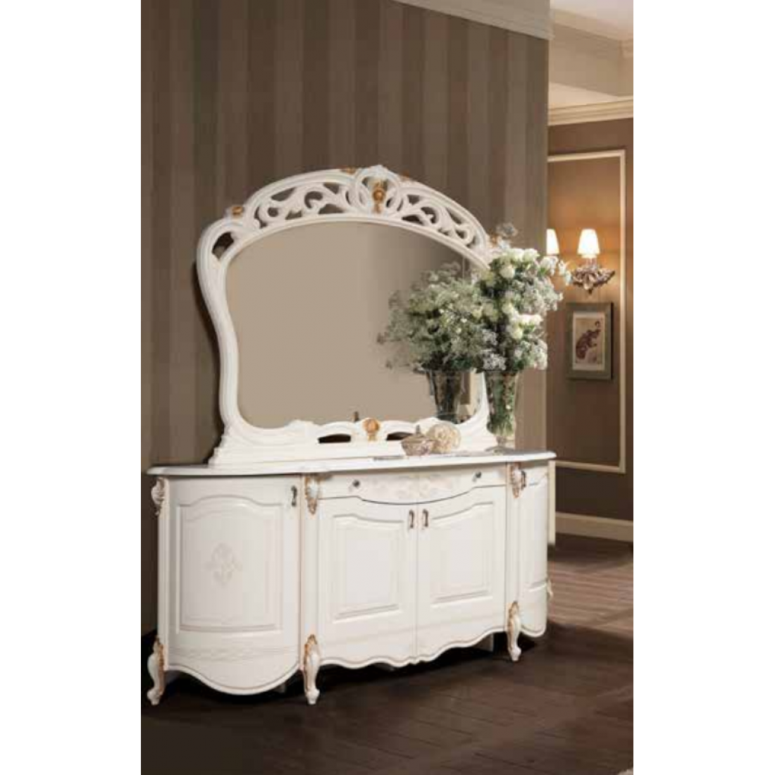 Комод Аллегро 5/2 – данная модель сделает вашу гостиную неповторимой и придаст ей богатую атмосферу. Он имеет четыре дверцы за которыми скрываются большие вместительные полки, что с легкостью поможет вам хранить все необходимые вещи. По середине есть не большая вытягивающаяся полка, которая по бокам имеет две ручки в виде кнопки. Комод «Аллегро» идет в комплекте с большим зеркалом которое украшено резной вставкой в сочетании с тонкой росписью, что подчеркнет классический стиль и послужит показателем богатства и престижа хозяев дома.
