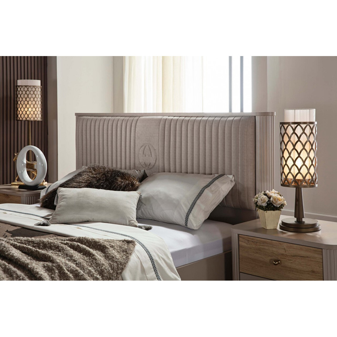 Кровать Санвито SANV-26 оригинальная по дизайну турецкая кровать в теплых постельных тонах из коллекции SANVITO. Мягкая спинка кровати декорирована тканью с вертикальной прострочкой. Скругленные боковины спинки с рифленой поверхностью создают объемный эффект. Кремовый цвет кровати прекрасно гармонирует с золотистыми вставками на витиеватых ножках. Боковины корпуса так же имеют округлую безопасную форму. Кровать представлена тремя размерами спальных мест: 150*200, 160*200, 180*200.