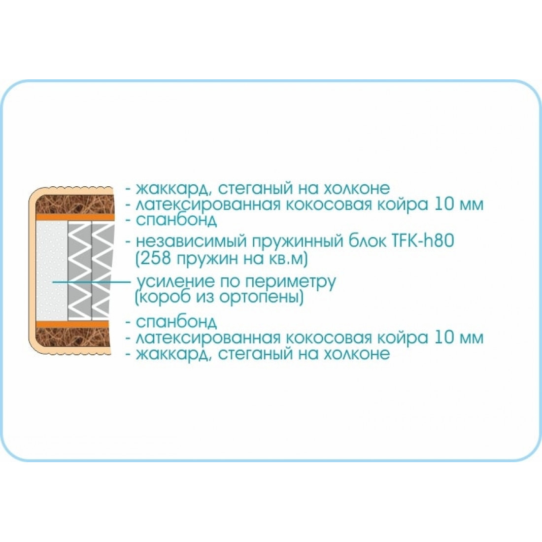 Наполнение: независимый блок TFK, высота блока 140 мм, кокосовая плита 10 мм с двух сторон, спанбонд с двух сторон, усиление по периметру - короб из ортопены.