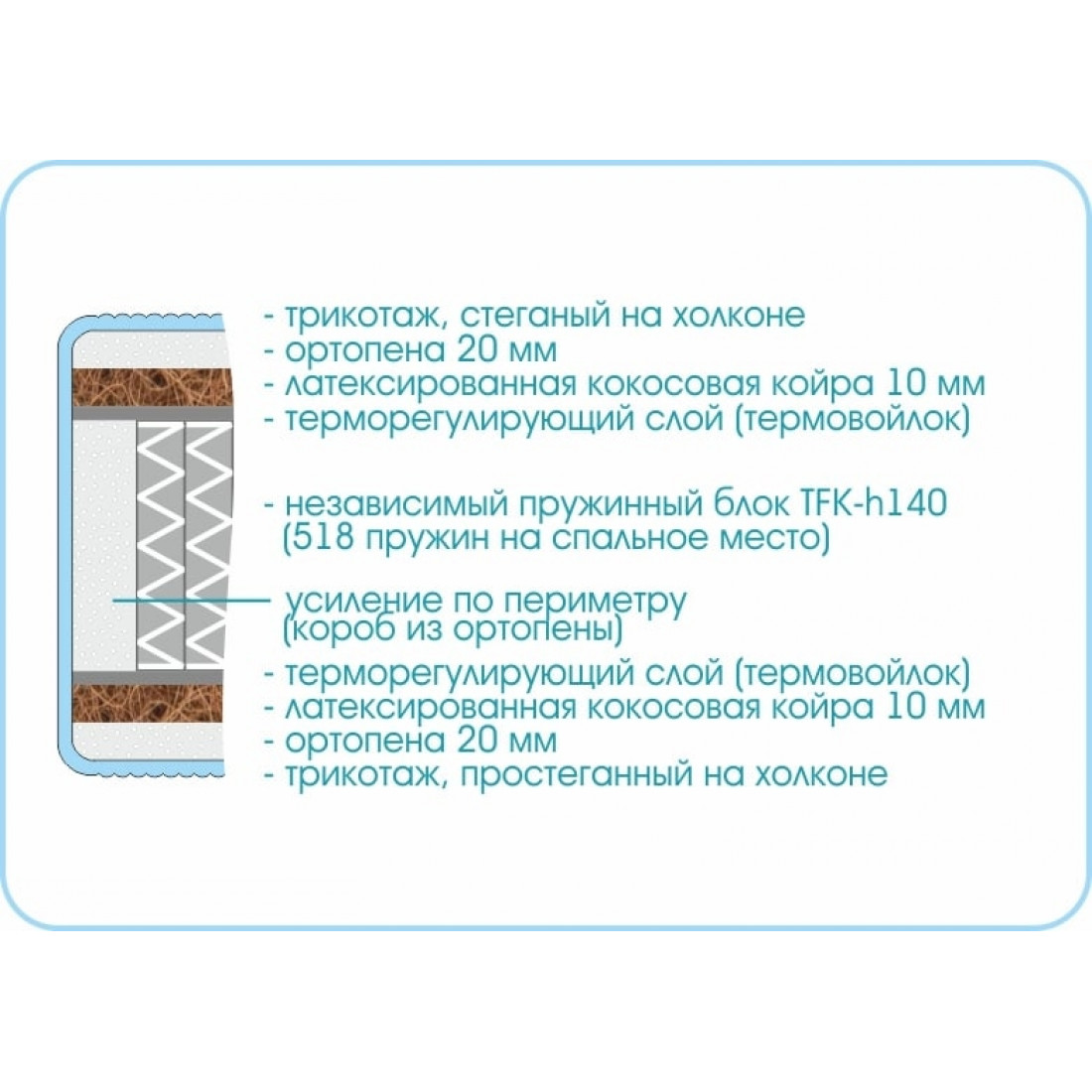 Наполнение: независимый блок TFK, высота блока 140 мм, ортопена 20 мм с двух сторон, кокосовая плита 10 мм с двух сторон, терморегулирующий слой с 2-х сторон, усиление по периметру - короб ортопены.