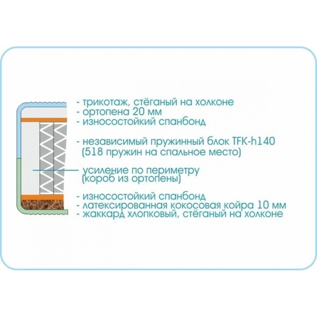 Наполнение: независимый блок TFK, высота блока 140 мм, ортопена 20 мм с одной стороны (зима), кокосовая плита 20 мм с другой стороны (лето), износостойкий спанбонд с двух сторон, усиление по периметру - короб из ортопены.