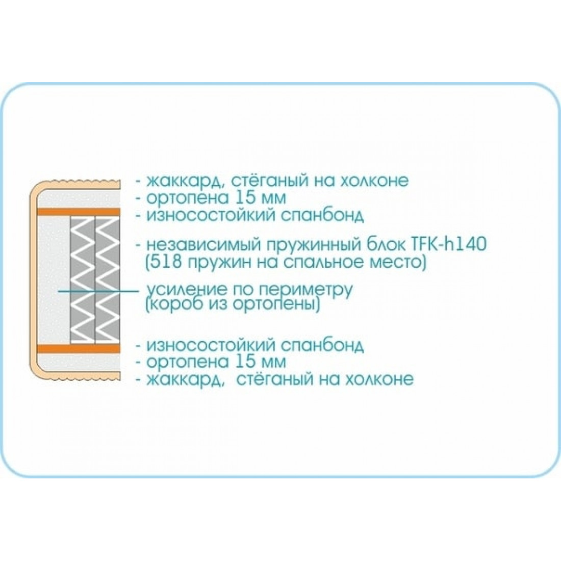 Наполнение: независимый блок TFK, высота блока 140 мм, ортопена 15 мм с двух сторон, износостойкий спанбонд с 2-х сторон, усиление по периметру - короб из ортопены.