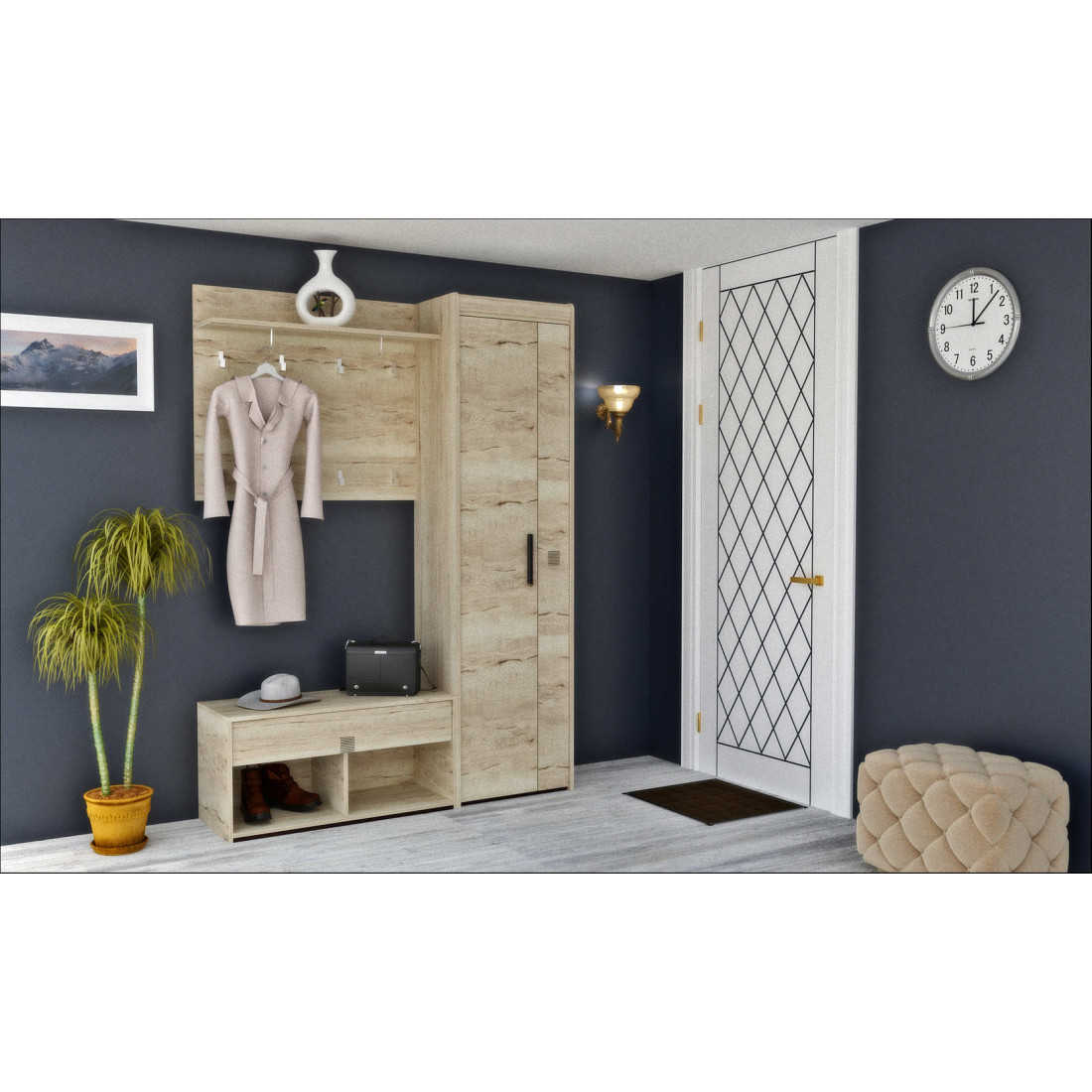 Прихожая «Мале» - обладательница лаконичного и свежего дизайна. Особое внимание привлекают тактильные ощущения от прикосновения к мебели. Декор и структуры, схожие с натуральным деревом по рисунку и шероховатости, придают глубину и естественность. Широкий спектр модулей позволит эргономично использовать Ваше пространство.
