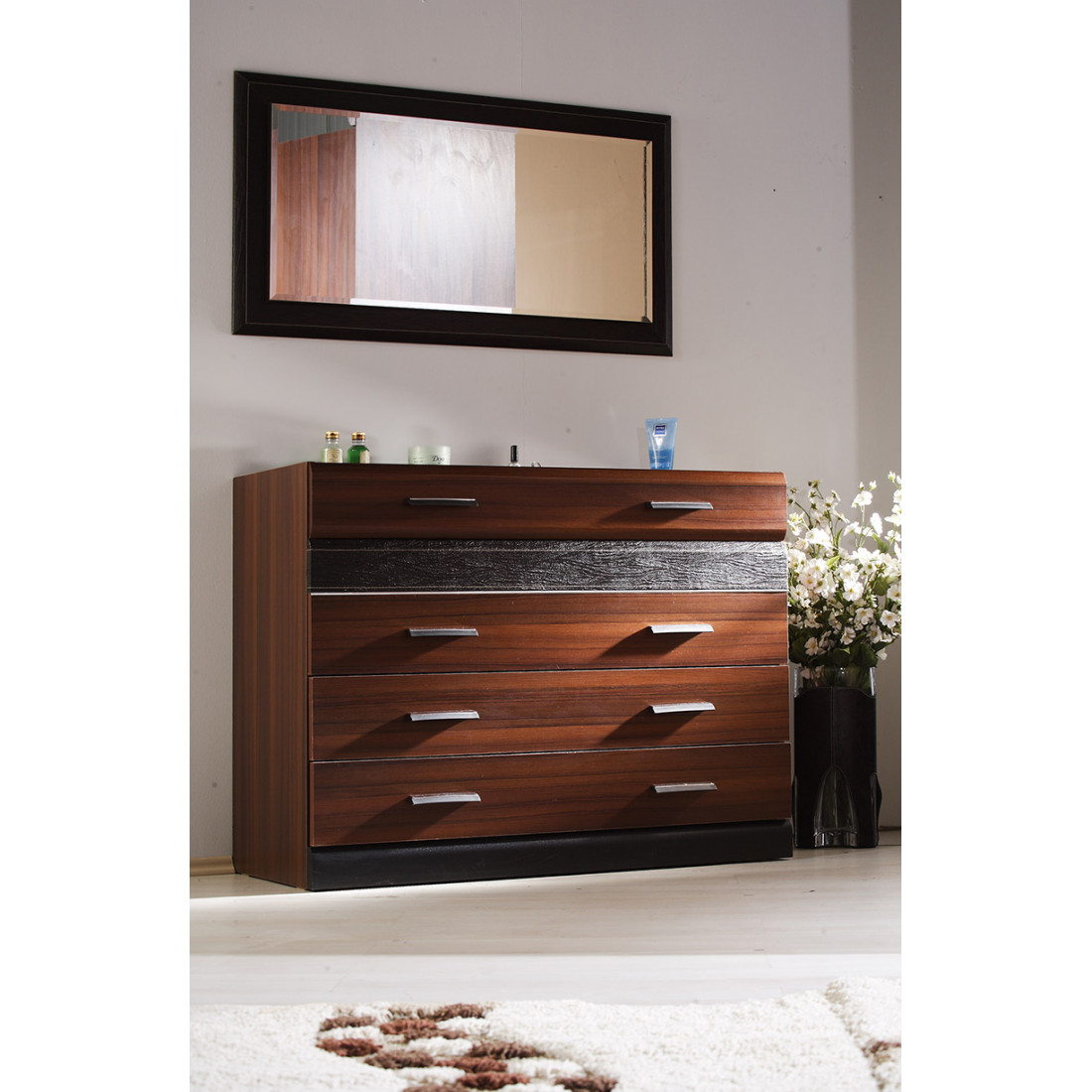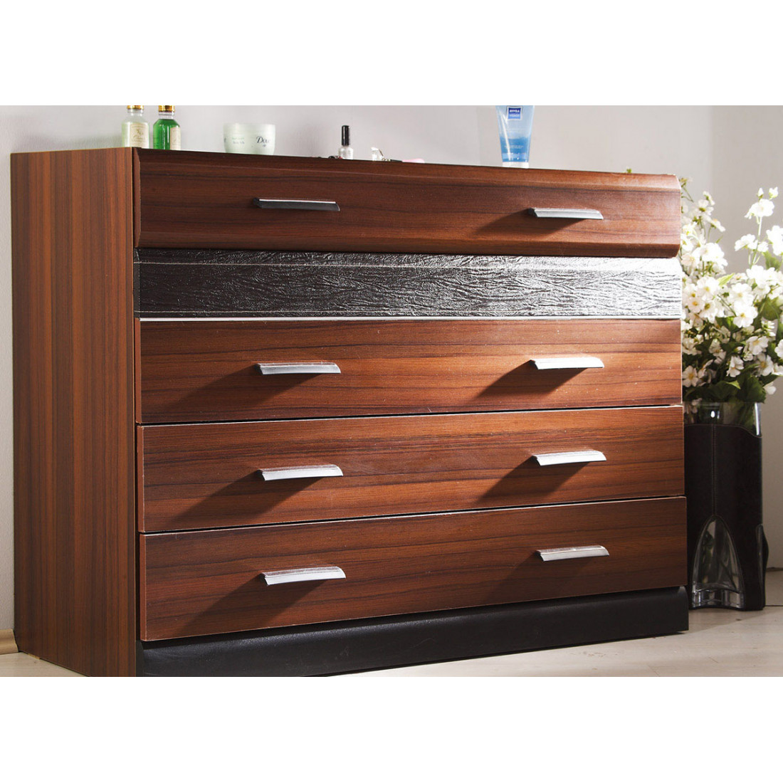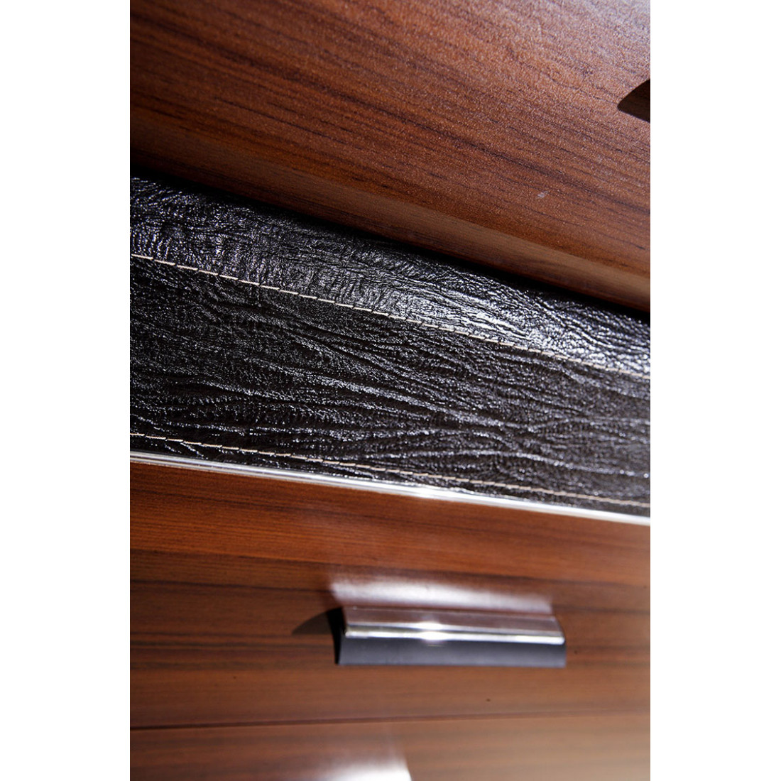 Широкий бельевой комод VERA-27 серии Вера от Беллона – неизменный элемент просторной спальни, многофункциональной гостиной и стильной прихожей. Купить вместительный комод приятного орехового оттенка с имитацией фактуры кокобола, с интересным декором в виде вставок из кожзаменителя, можно в комплекте с зеркалом.