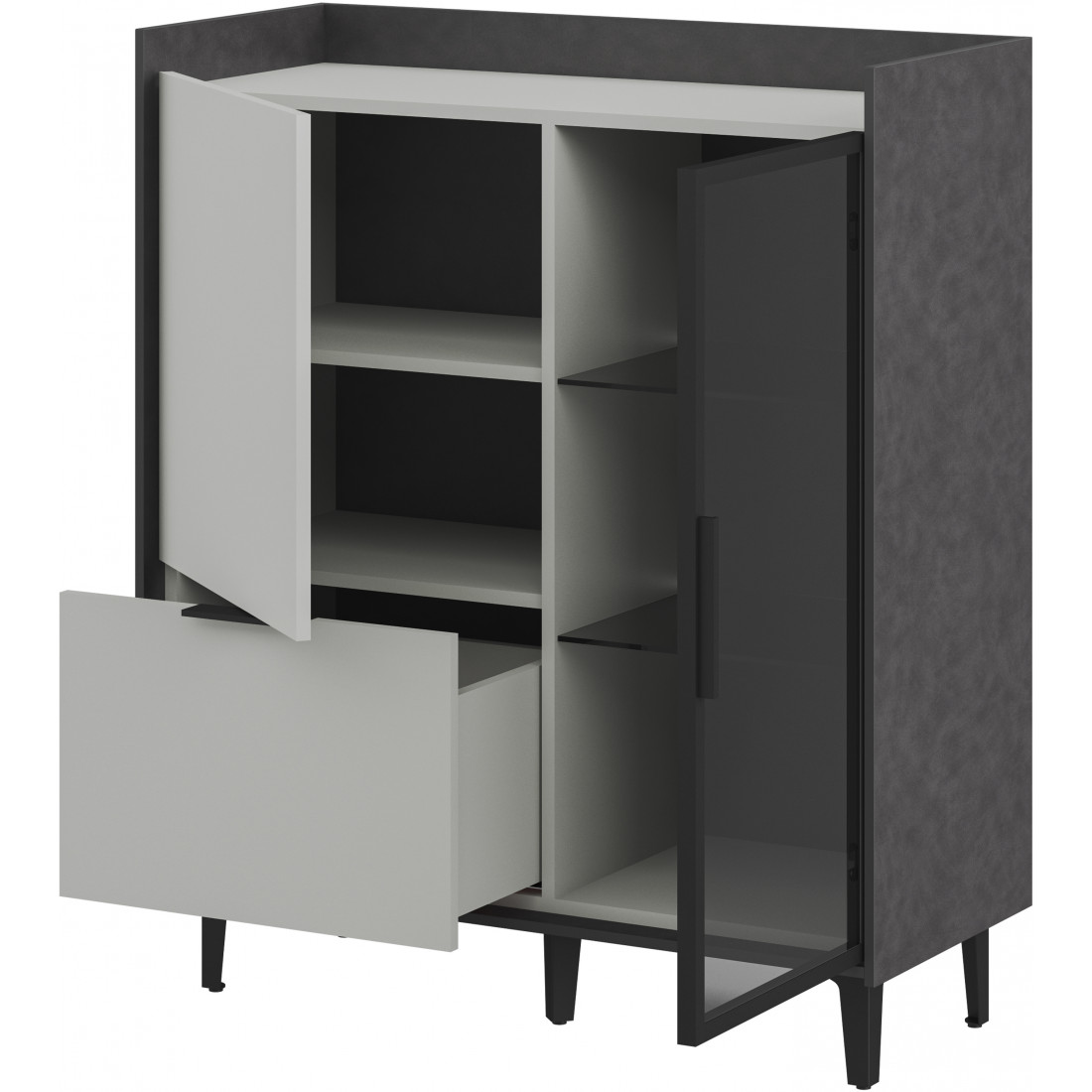 Шкаф Модена — это стильное решение для вашей гостиной с двумя уникальными отделениями. Подчеркните ваш дизайн, выбрав цвет из трех вариантов: Белый-Дуб Элисон, Лунный камень-жемчуг, Металл Бруклин-лунный жемчуг. Ножки из металла обеспечивают устойчивость. Первое отделение предлагает большой ящик и полки для удобного хранения разнообразных предметов, а второе — элегантные стеклянные полки и фасад из темного стекла, придающие шкафу изысканный вид. Шкаф Модена — идеальное сочетание функциональности и эстетики для вашей гостиной