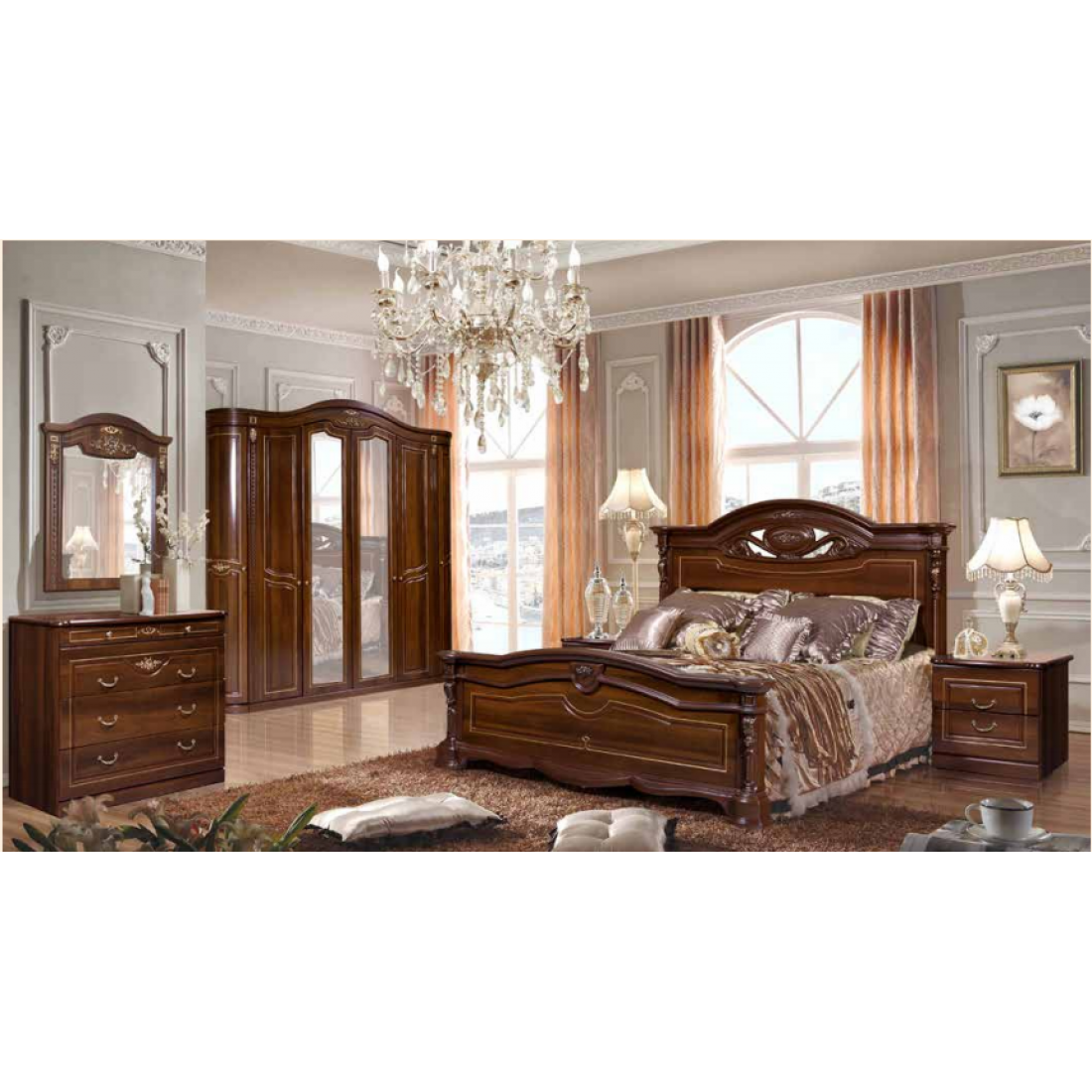 Спальня Сорренто (орех) – изящные формы, высокая резная спинка и благородный ореховый цвет в сочетании с золотом. Каждая деталь продумана до мелочей. Королевская кровать дарит Вам чудную атмосферу старинного уюта, мир в котором царит спокойствие и благополучие. За последние годы появляется все новые и новые стили в оформлении интерьеров, но интерьер оформленный в классическом стиле, по-прежнему остается актуальным. Каждый элемент этой спальни послужит показателем богатства и престижа хозяев дома.
