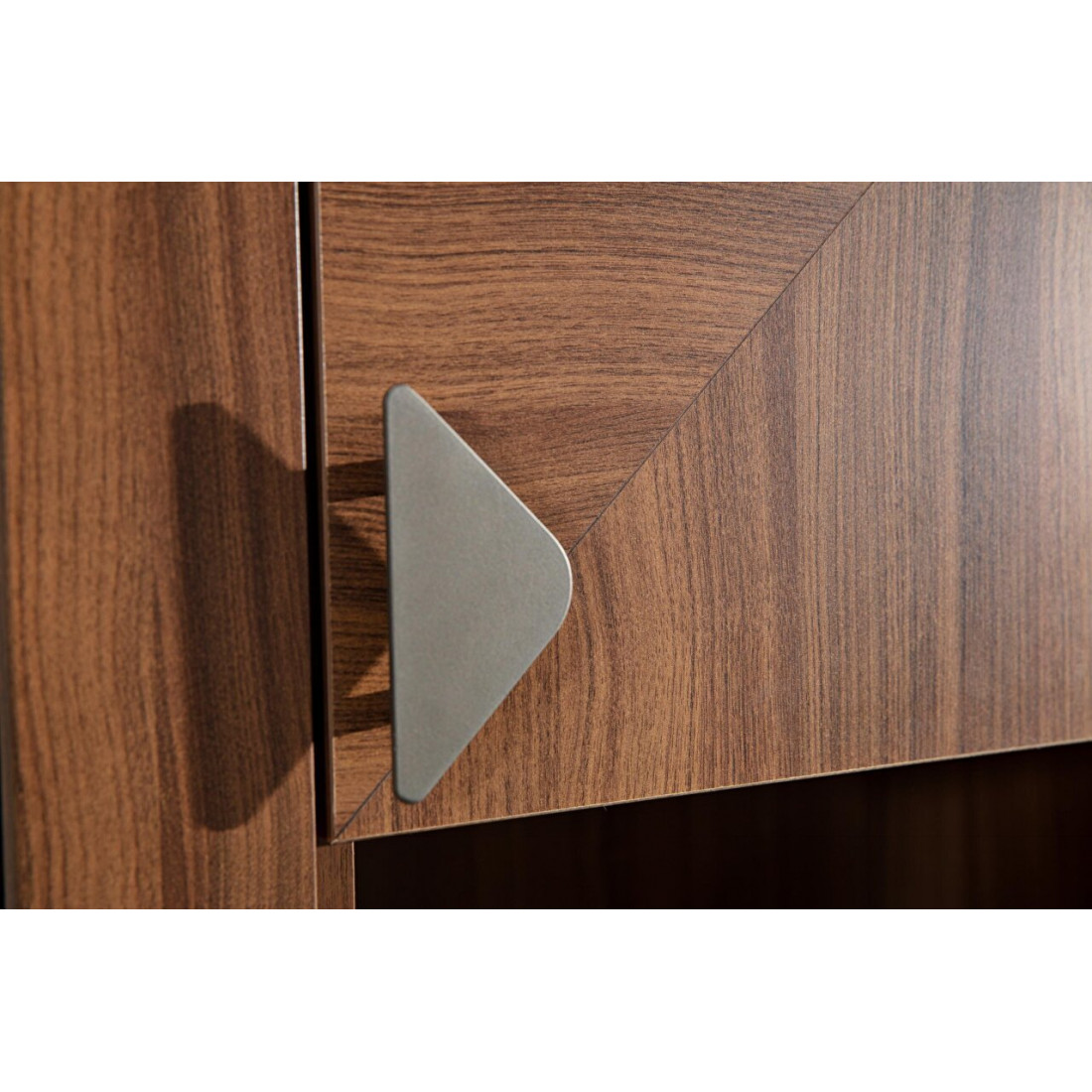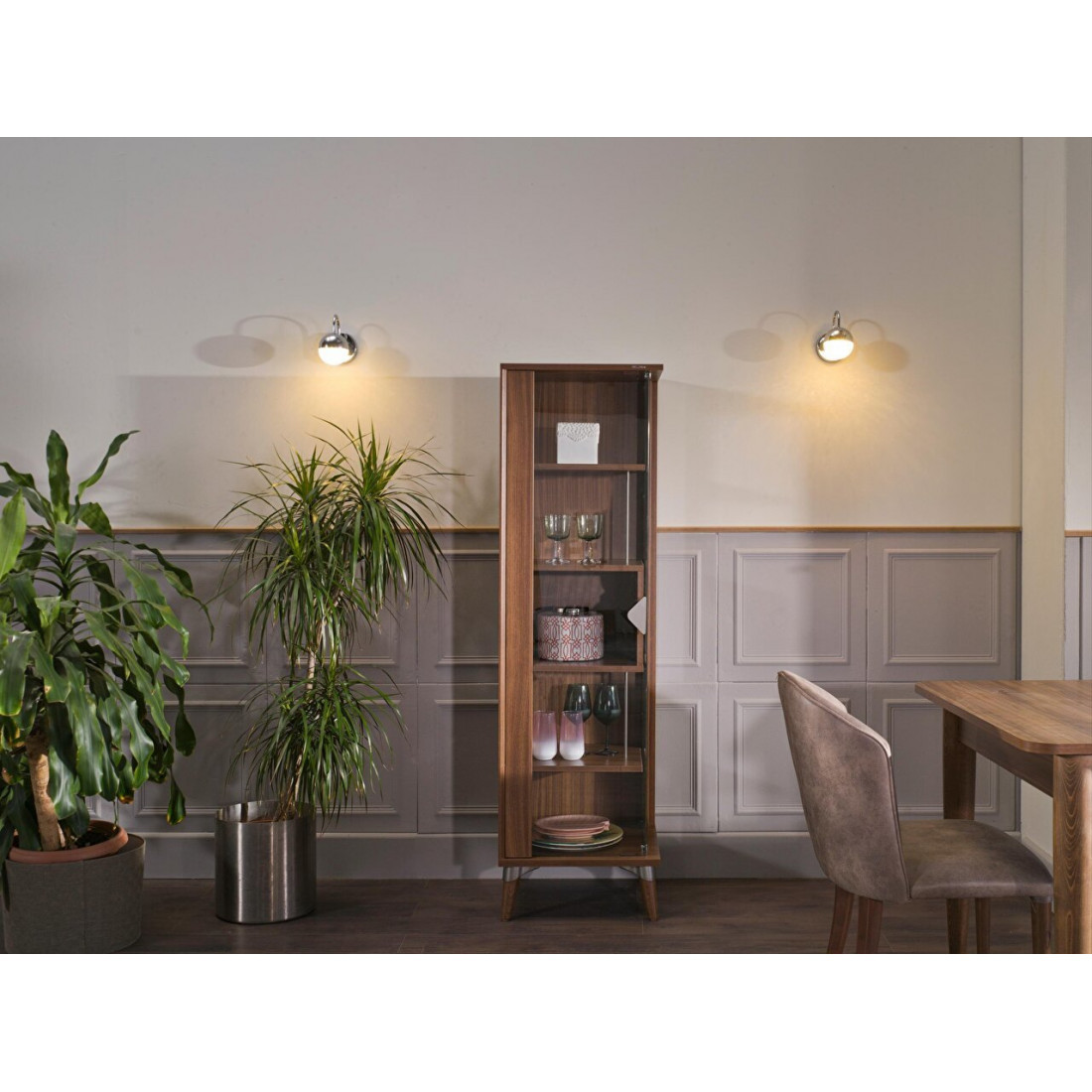 Изделия представлены в цвете грецкого ореха. Ручки изделий в наборе представлены металлические. Для увеличения срока службы и простоты использования в дверце шкафа использовался механизм мягкого закрытия. Высокие ножки позволяют легко убираться в доме. Сервант имеет широкую область для хранения благодаря своей стеклянной дверце.